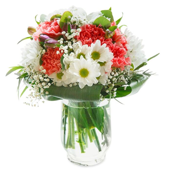 Our visually stunning flower arrangement is perfect for making any day special. This bouquet combines snow-white chrysanthemums, delicate gypsophila, and soft pink carnations, artfully arranged with vibrant aspidistra leaves for a one-of-a-kind display.